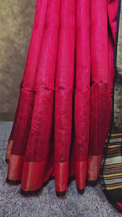 This handloom silk saree blends bold color play with refined craftsmanship, making it a standout choice for stylish occasions. The vibrant red body contrasts beautifully with the deep black pallu, enriched with detailed thread-work motifs. It's texture and natural sheen add sophistication while keeping the drape easy to manage. Traditional weaving techniques meet contemporary aesthetics, giving the saree a distinct visual identity. Whether worn at celebrations or office events, it delivers a confident and polished look.