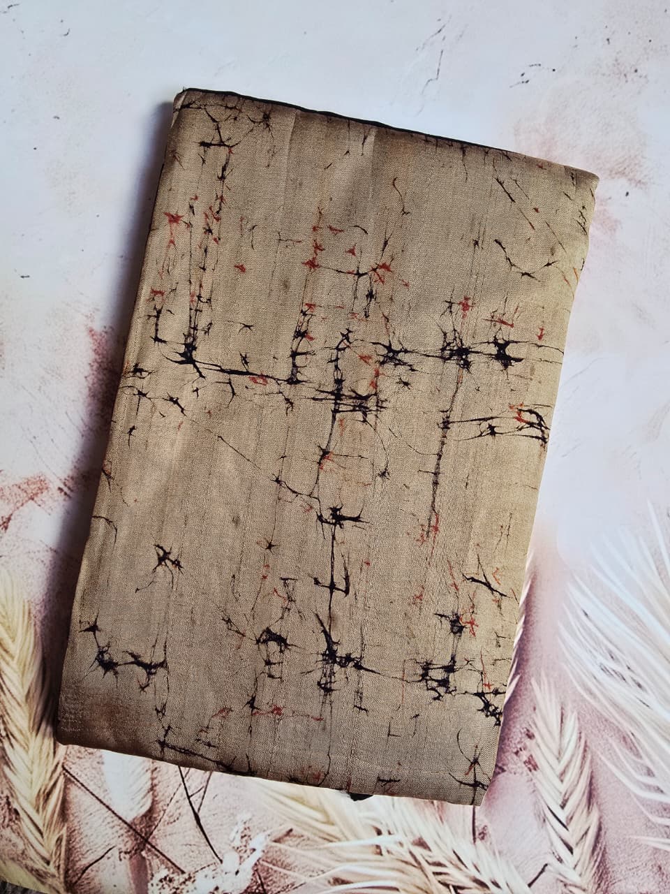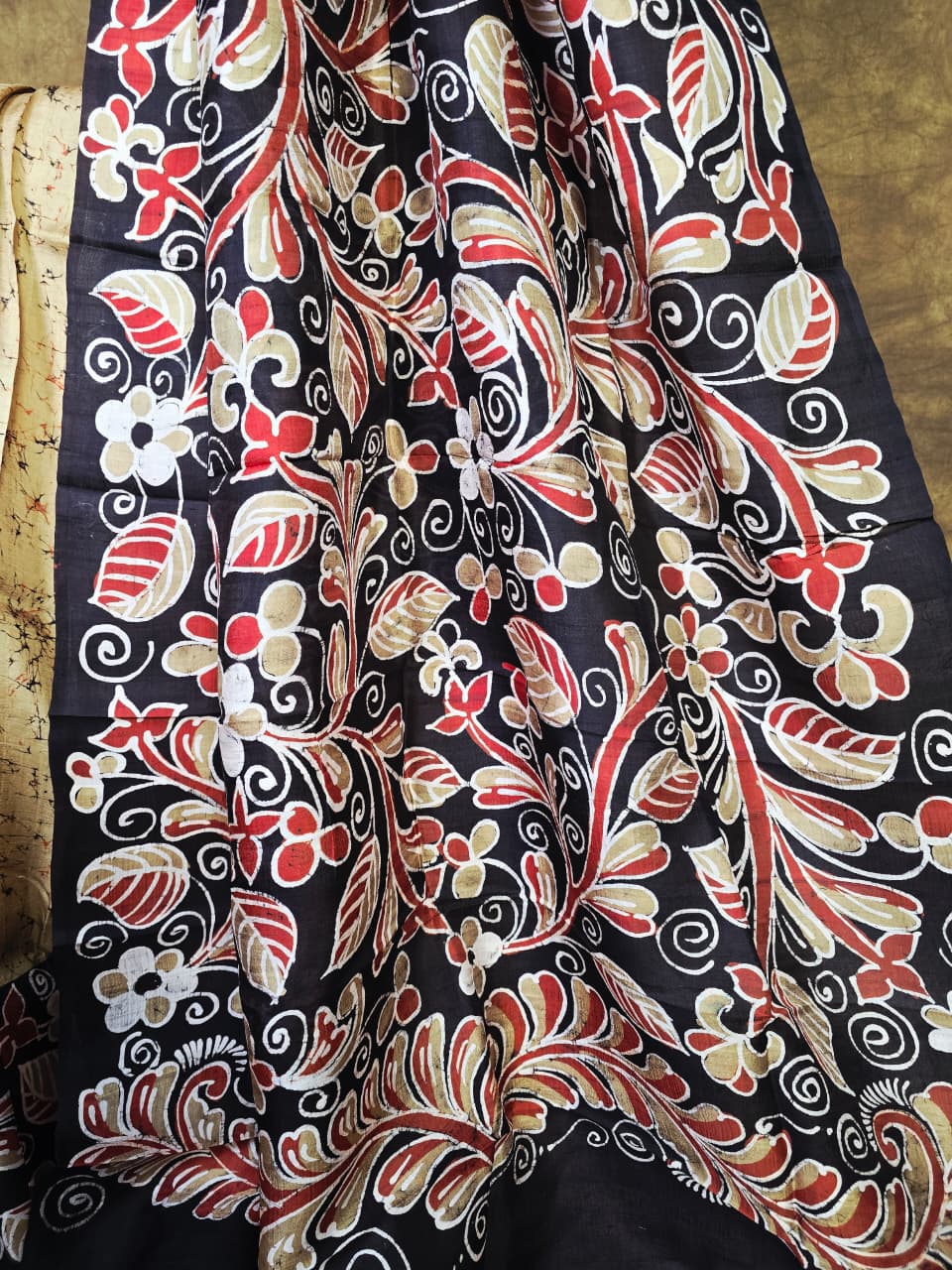 Every motif is individually crafted using traditional batik techniques, giving the saree an artistic and bespoke appeal. The floral and swirl patterns add depth and character to the design.