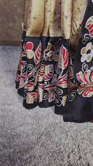This handloom silk saree showcases an eye-catching blend of deep black and warm beige, enriched with vibrant hand-painted batik artwork. The intricate floral and leaf motifs stand out boldly, giving the saree a distinct artistic character. Its smooth handloom texture ensures a refined drape, while the color harmony brings a modern yet traditional vibe. Perfect for women who appreciate unique craftsmanship, this saree offers both style and comfort. The detailed border work makes it look rich without being overpowering, making it suitable for multiple occasions.