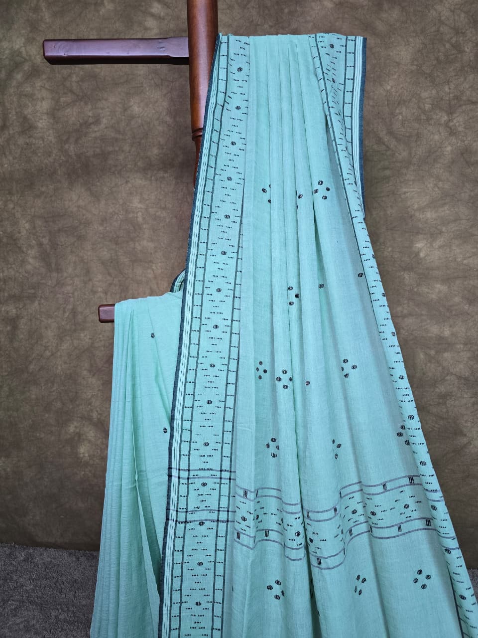 A thoughtfully handwoven pista green Jamdani cotton saree with black motifs and tassels, designed for comfort and everyday wear. Perfect for those who value breathable fabric and authentic craftsmanship.
