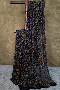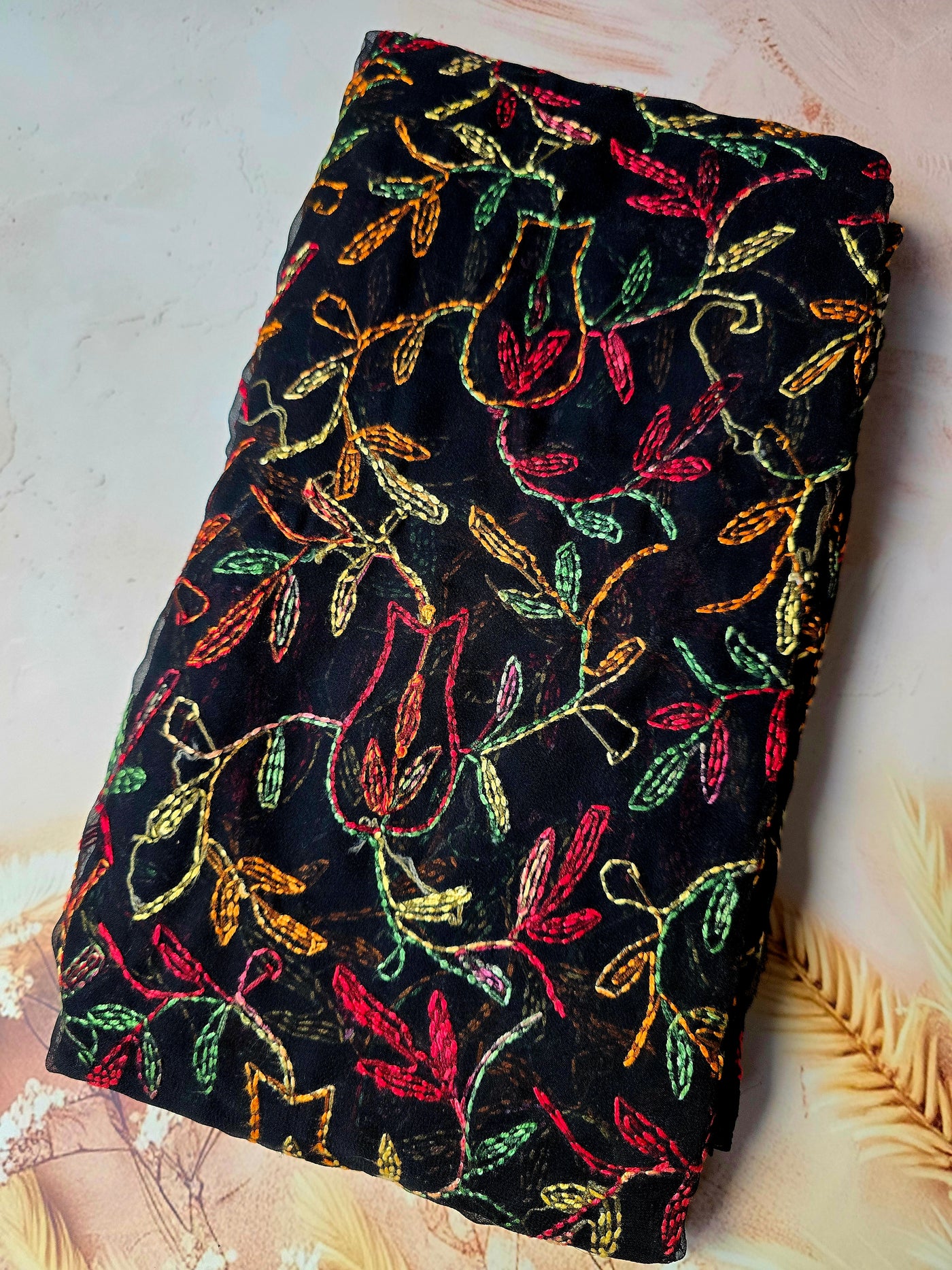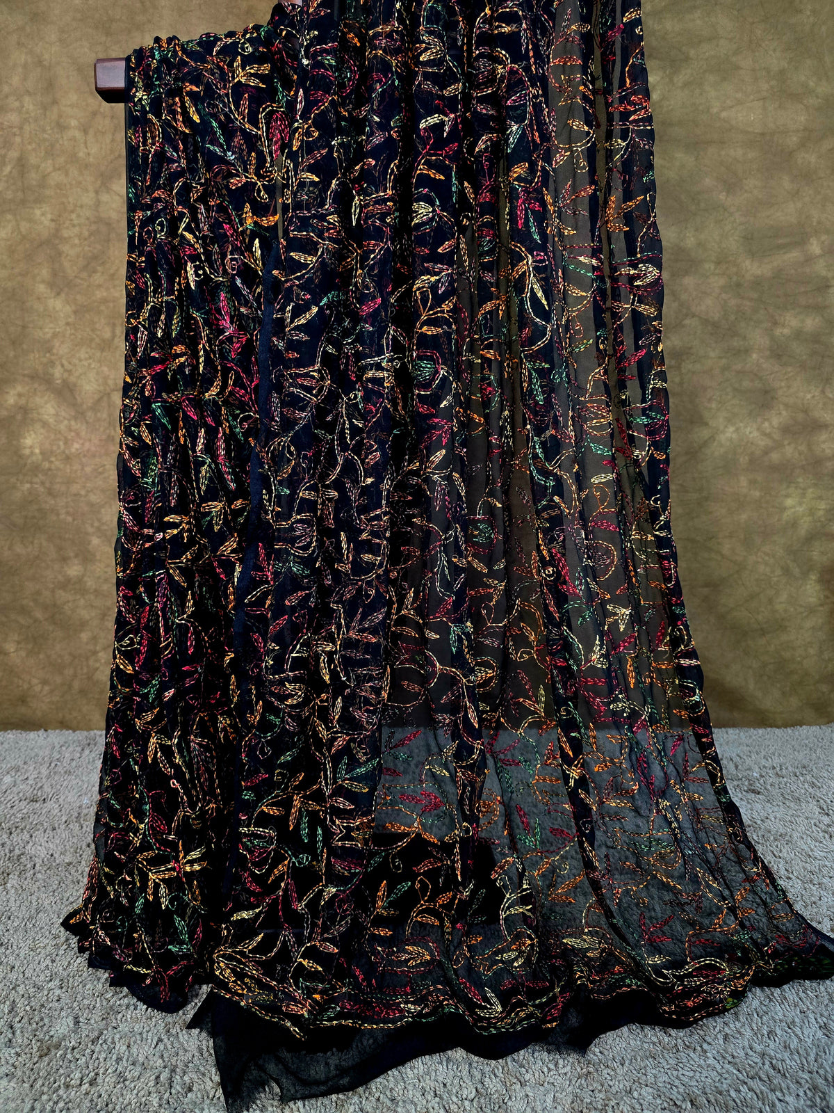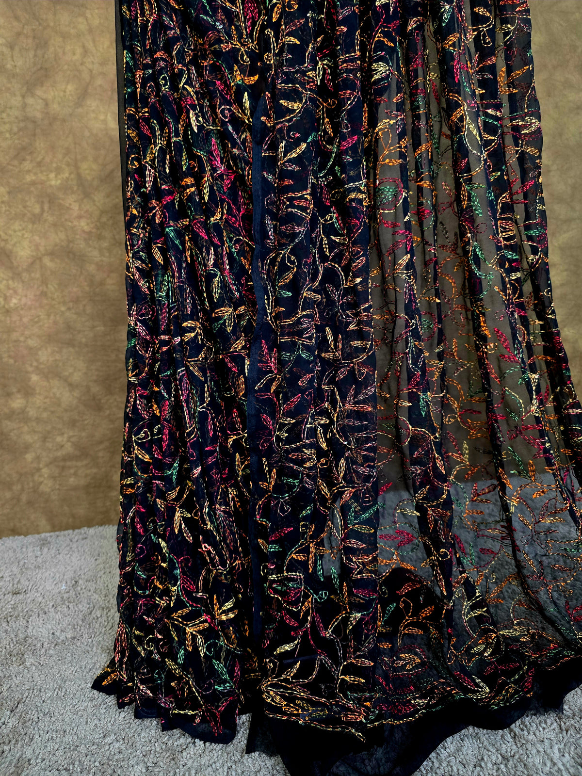 Black Beauty Tepchi Chikankari Saree with Multi-Colour Hand Embroidery