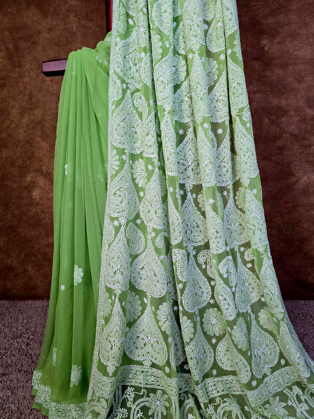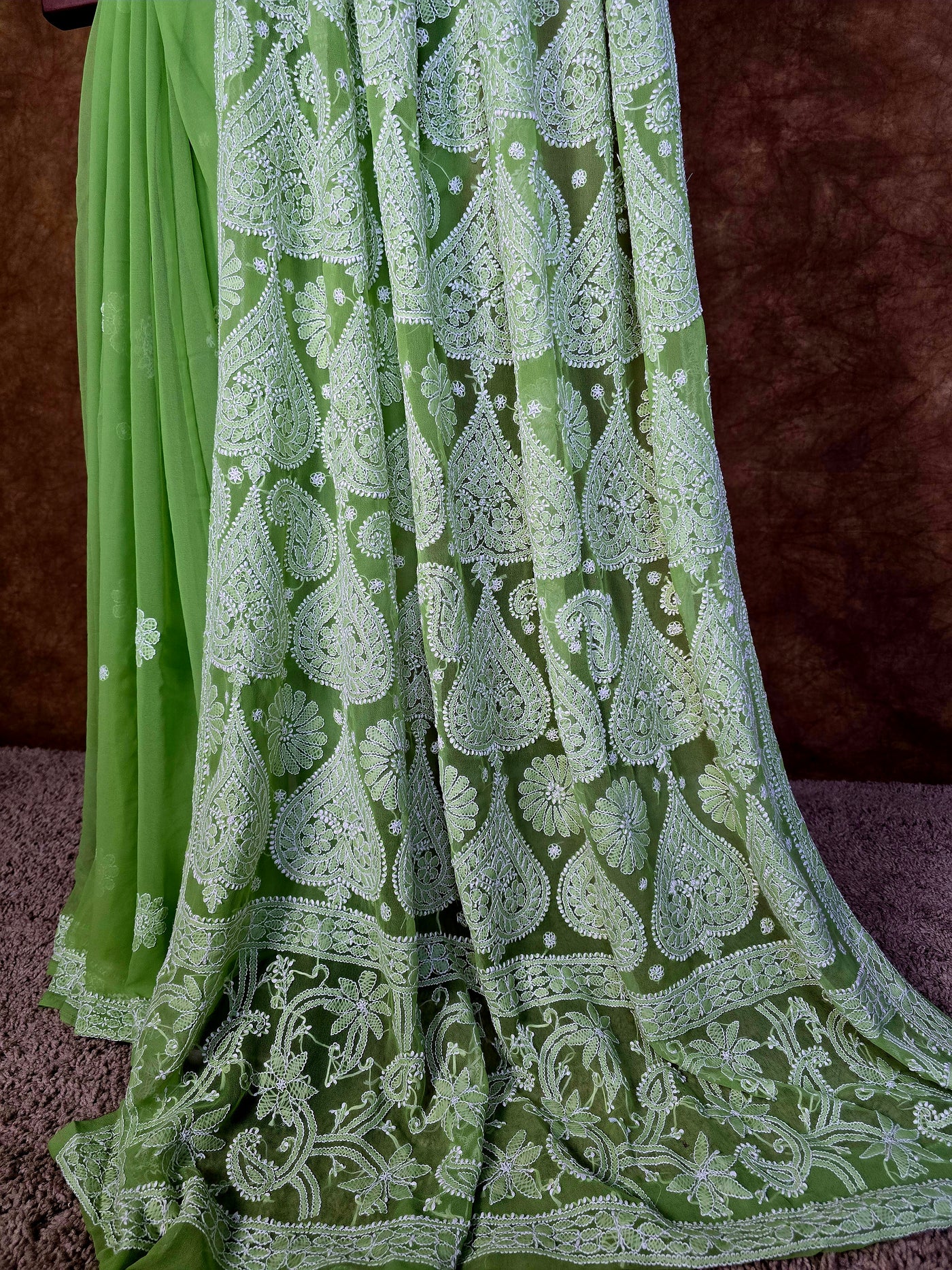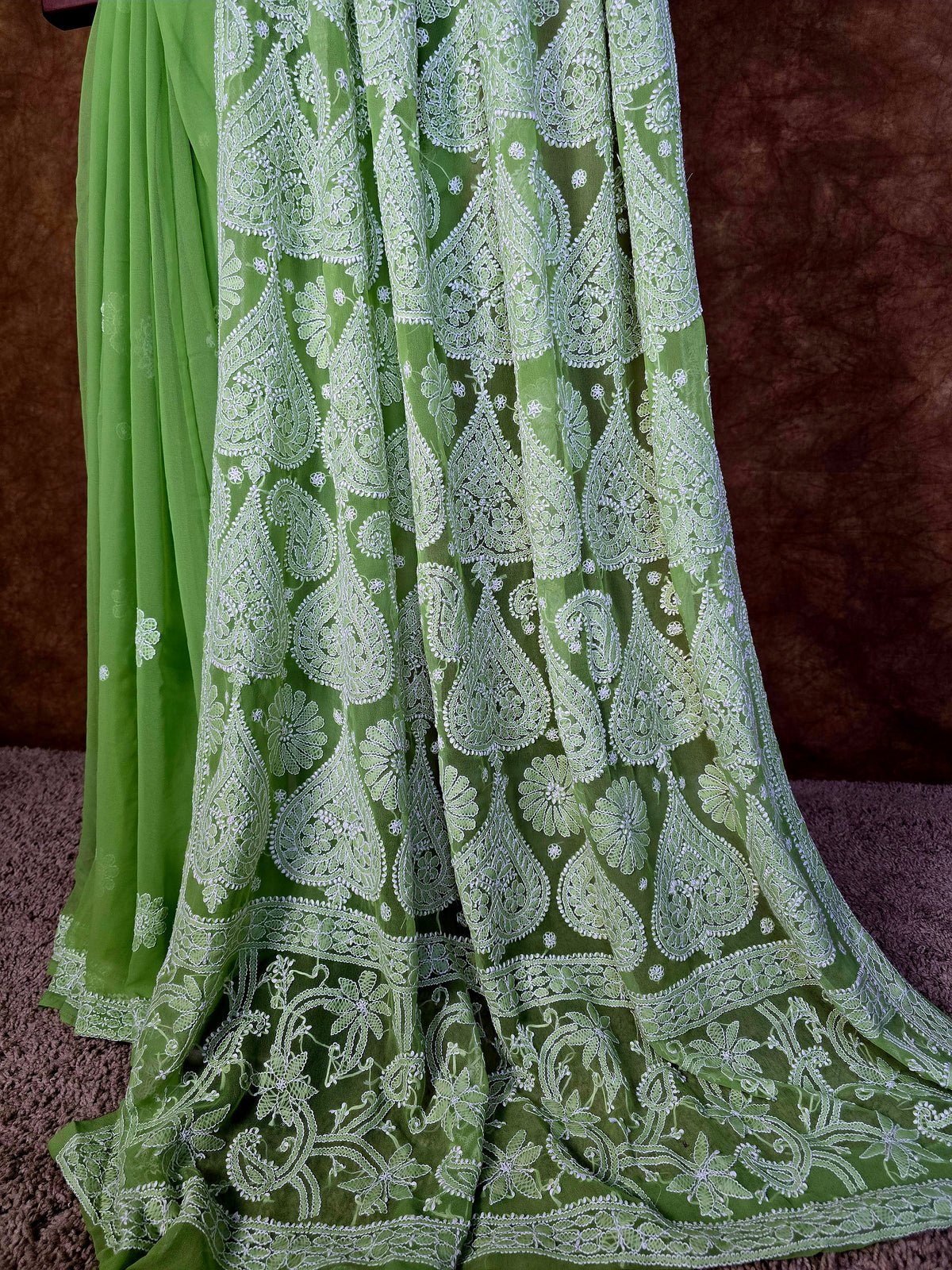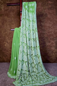 Stylish Green Chiffon Chikankari Saree with White Paan Design Pallu