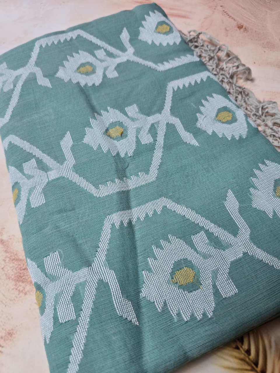 This handloom cotton saree in a soothing shade of green is designed to offer both comfort and style for girls and women alike. The gentle green color lends a fresh and natural appeal, making it ideal for a wide range of occasions—from office hours to casual gatherings. The saree features a beautifully crafted pallu with intricate floral motifs in white and subtle yellow accents that add a delicate charm to it's overall look. Made from breathable cotton fabric, it ensures all-day comfort while maintaining an effortlessly elegant drape. Whether worn for professional settings or family get-togethers, this saree blends tradition and ease beautifully. A matching blouse piece is included for a seamless, complete outfit.