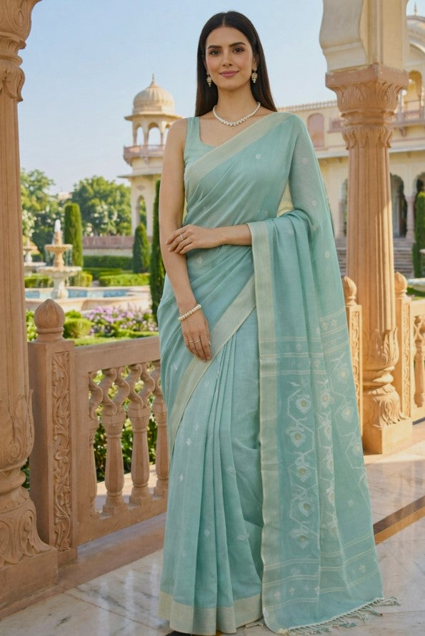 This soft green handloom cotton saree with it's delicate floral pallu offers a perfect mix of comfort, tradition, and everyday wearability. Designed to suit women and girls of all ages, it is an ideal choice for anyone looking for a natural, breathable fabric with subtle handcrafted beauty. The included blouse piece makes it easy to complete your look, whether for work, social occasions, or family functions.