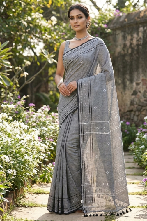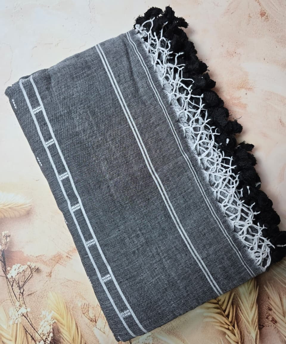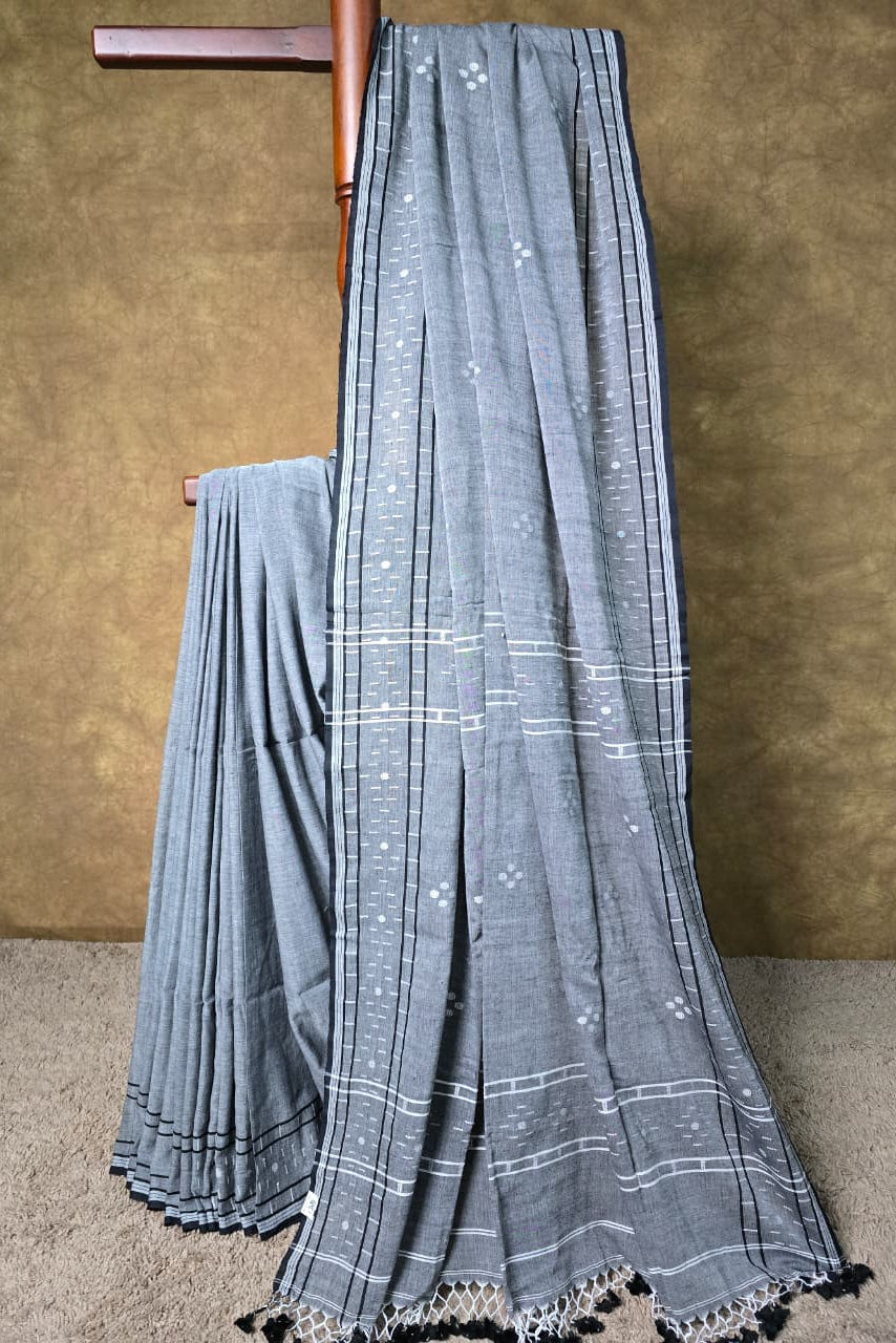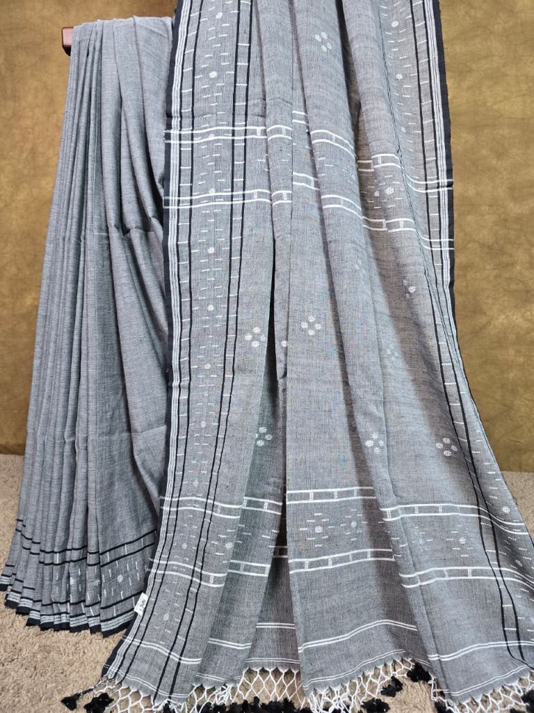 Small white motifs are evenly spread, creating a balanced and uncluttered appearance. Linear woven patterns along the borders enhance structure and add subtle visual interest. The pallu is finished with handcrafted tassels, offering a relaxed and stylish detail.